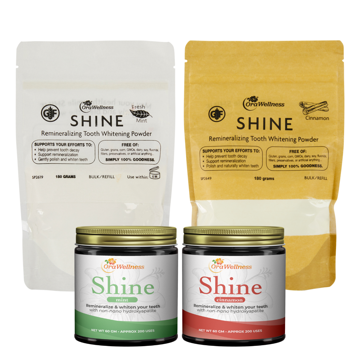 Mix Shine powder 50/50 with organic coconut oil (which is also great for oral health) to form a more mild-tasting paste to brush with.